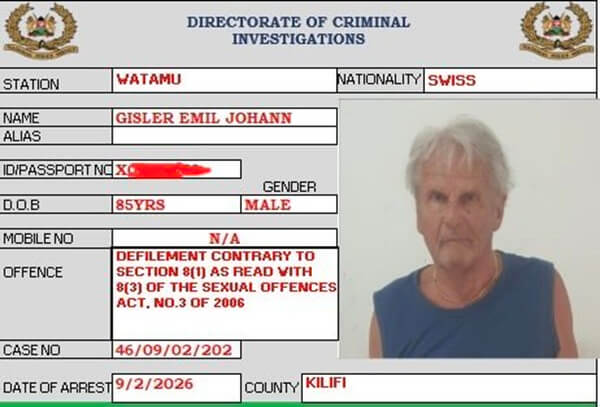 Acting on a tip-off from members of the public that a foreigner was seen with a juvenile in one of Watamu’s villas, police moved swiftly and discovered Gisler with the minor inside the residence.